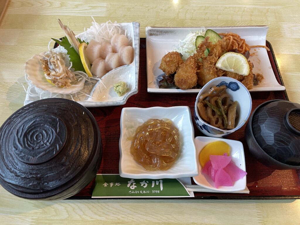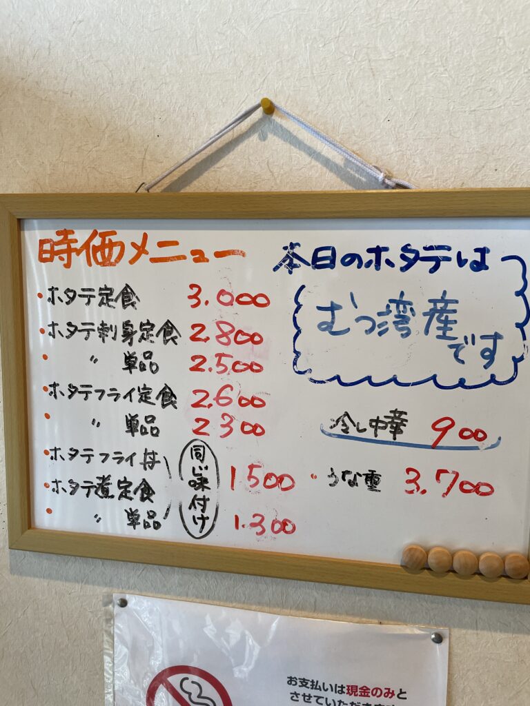この日のホタテはむつ湾産で、価格は3,000円。刺身は歯応えと甘みのバランスがよく、フライは旨味がしっかり感じられて絶品。まさに下北ならではの味覚でした。