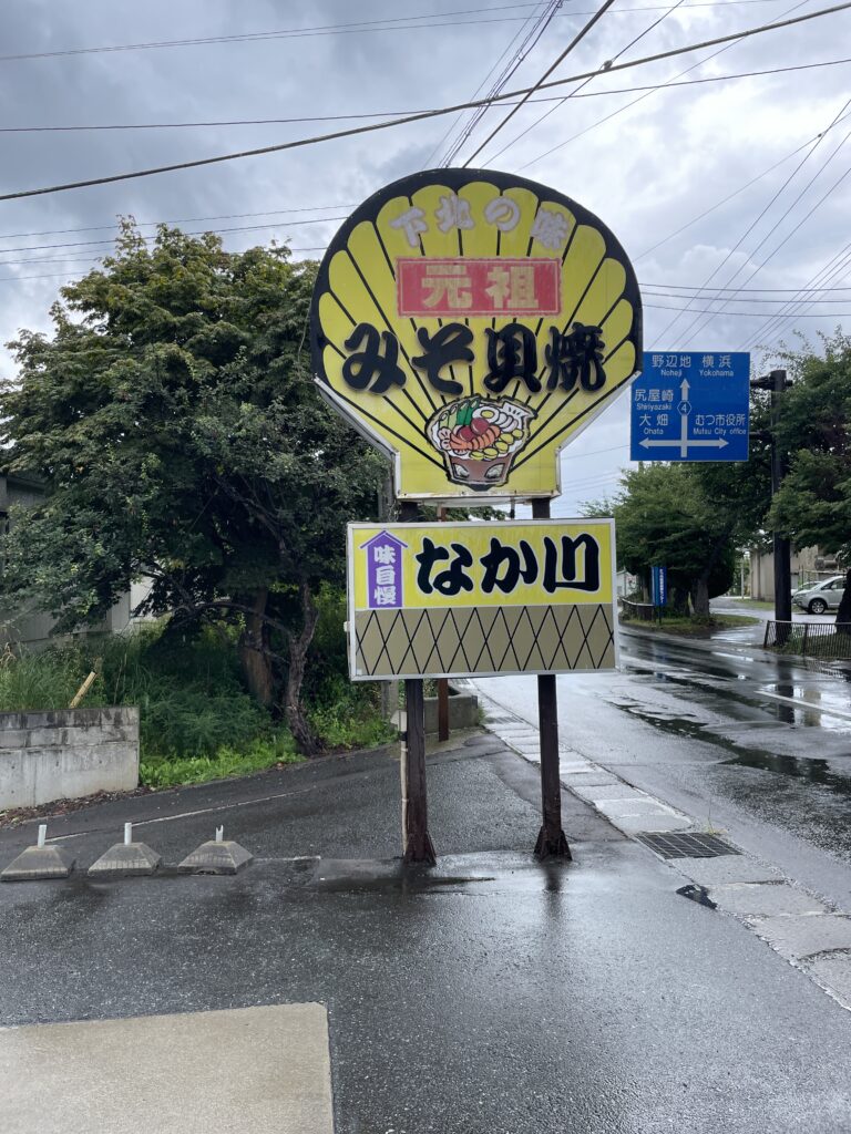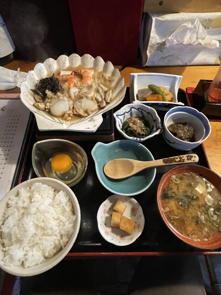この日のメインは「味噌貝焼き定食」。大きなホタテの殻を鍋代わりにして、味噌と卵で煮立てたご当地料理です。熱々の味噌の香りと、ホタテの旨味が絡み合い、心も体も温まる一品でした。