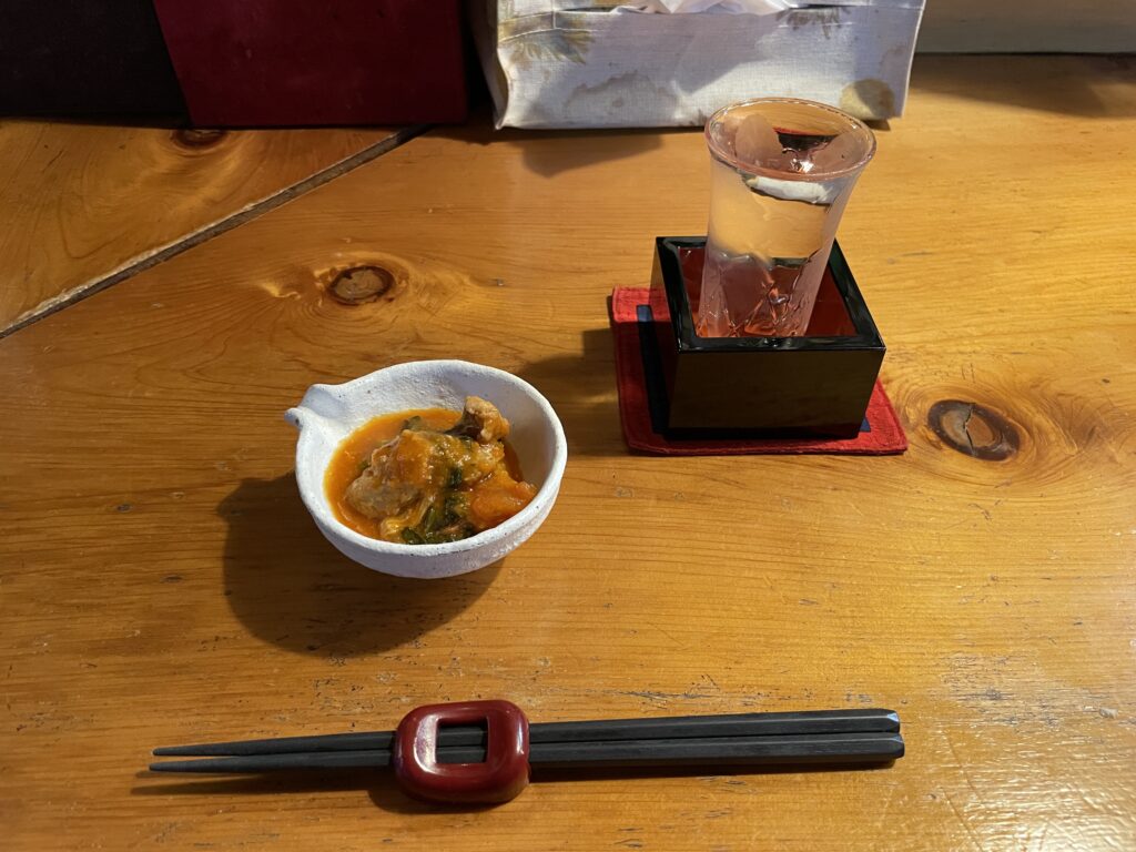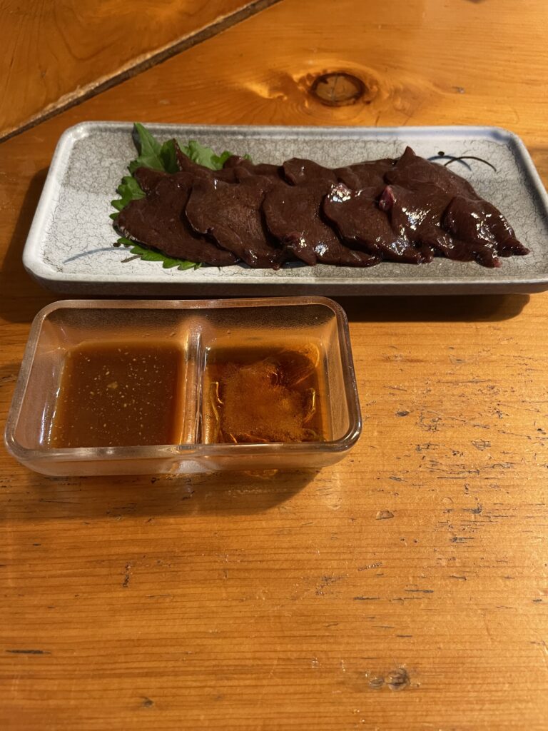 まずは地元のお酒「寒立馬」とお通しで一杯。店内は早めの時間だったこともあり、静かに落ち着いて過ごせました。馬レバー刺しは初めて食べましたが、新鮮で臭みがなく美味しく頂けました。